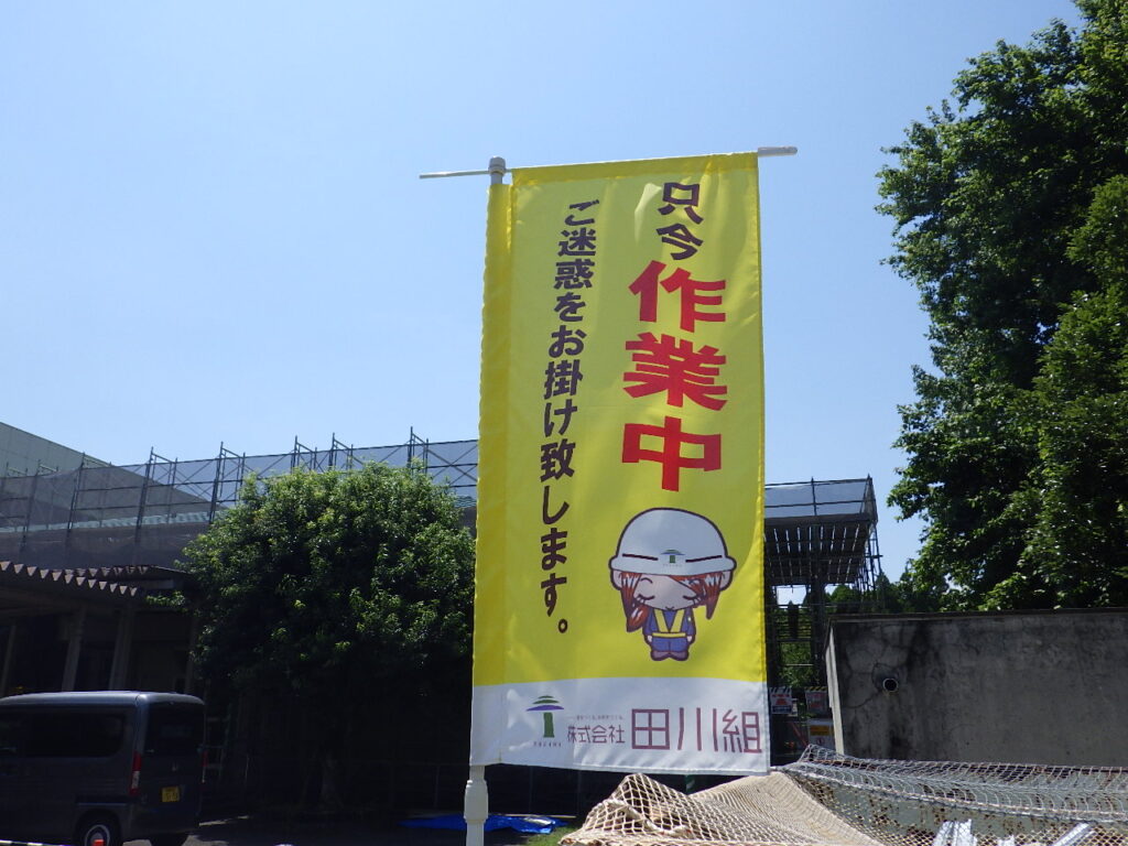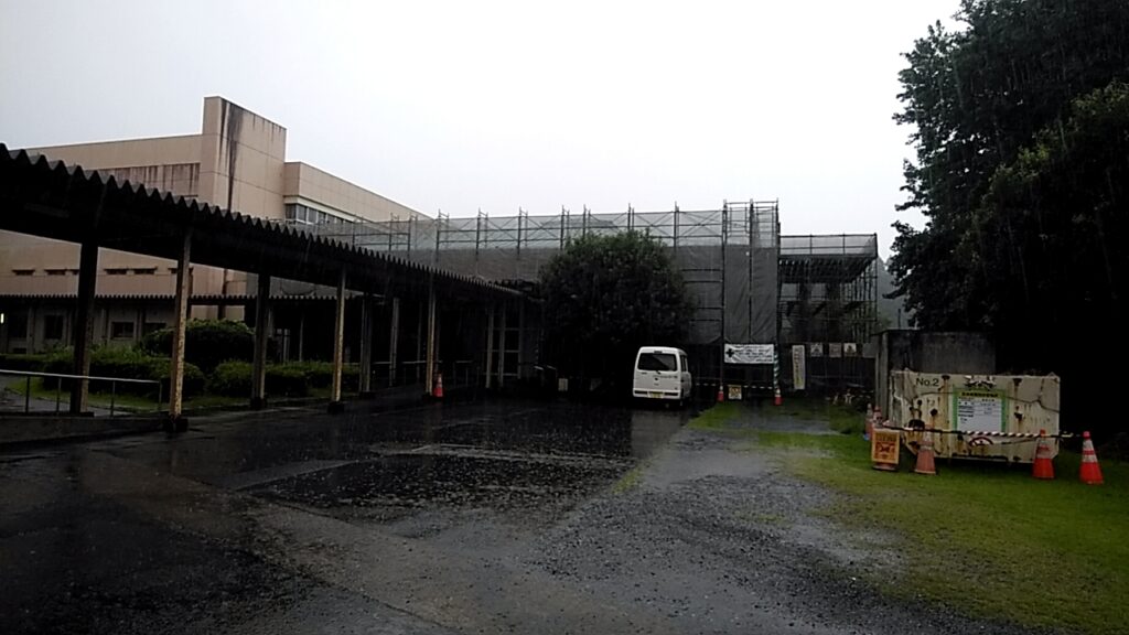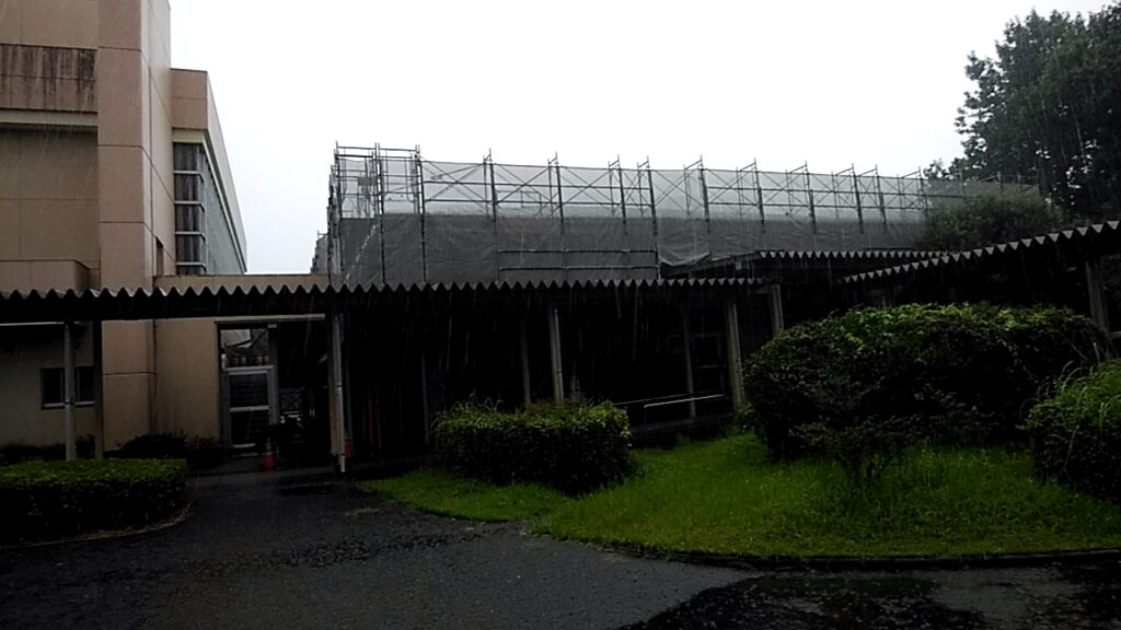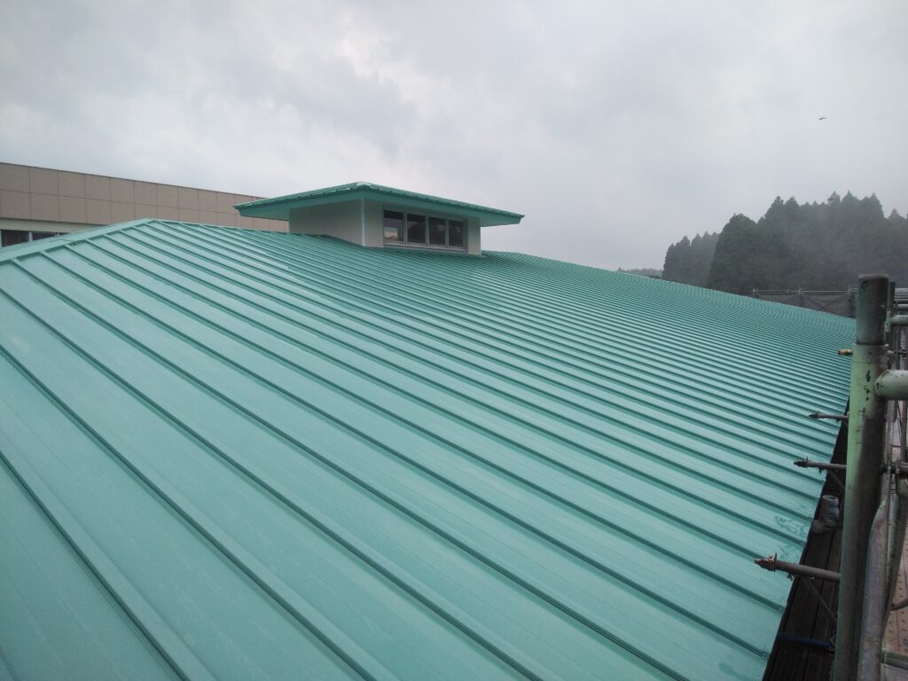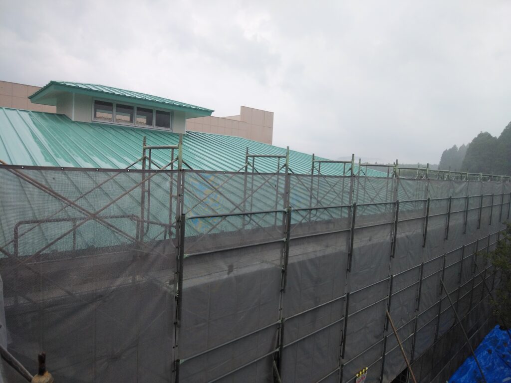 南九州市知覧町西元地内にて知覧中学校武道館屋根改修工事を瓦棒葺きカバー工法で進めています。
