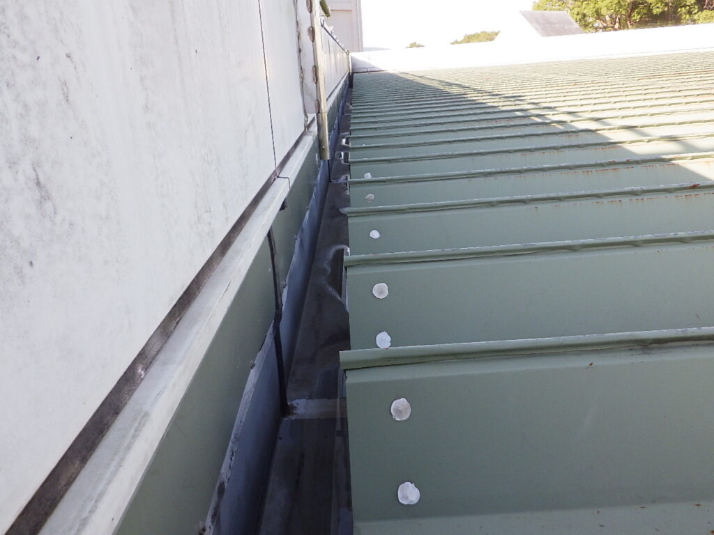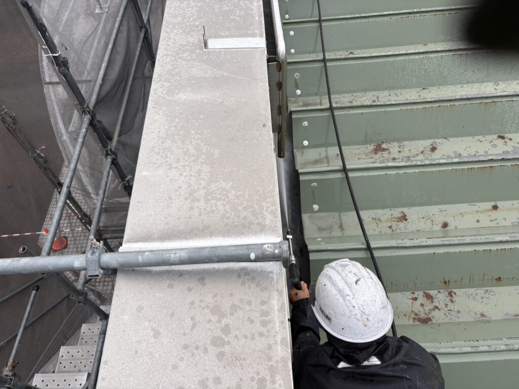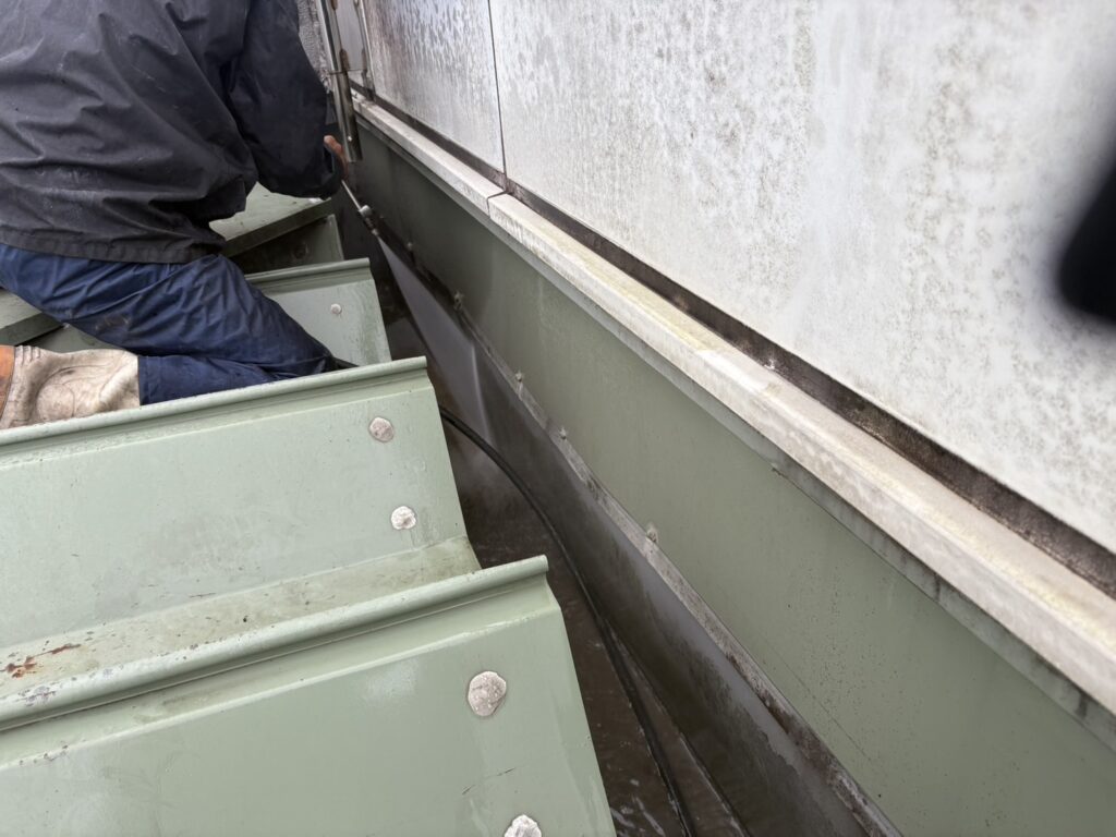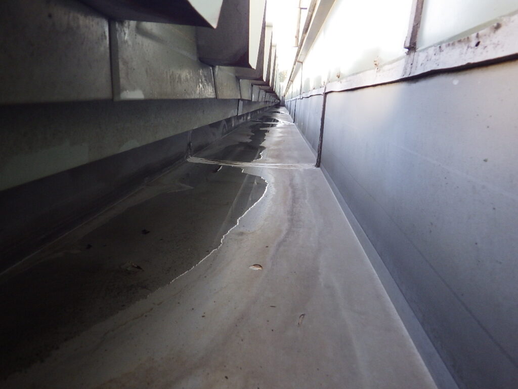 先日、屋根の箱樋の塗膜防水工事前の高圧洗浄水洗いをおこないました。