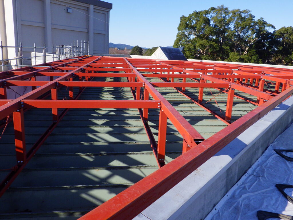 鉄骨組立完了検査確認後、折板屋根工事の施工に入っていきます。