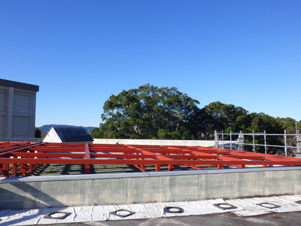 現在鉄骨工事の屋根折板下地、軒先鉄骨下地、外壁鉄骨下地などの現場組立を進めています。