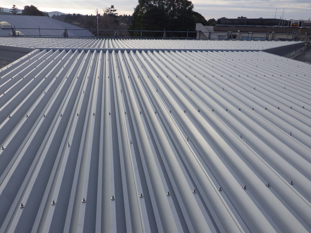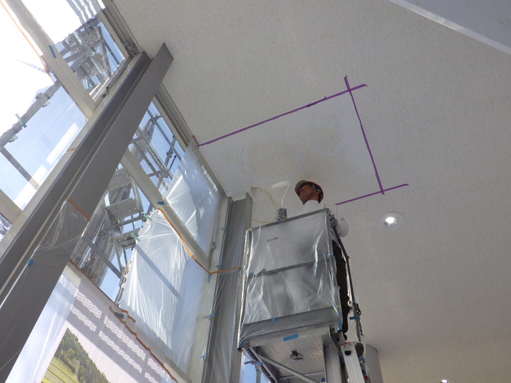 先日、エントランスホールの天井ボード面の塗装塗り替え補修を行いました。
