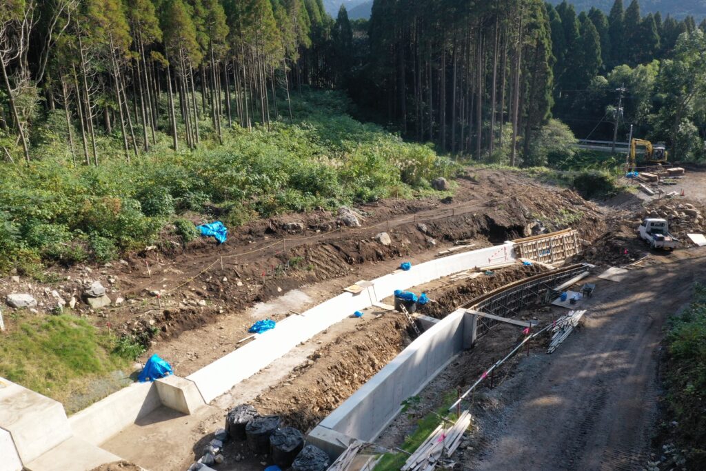 進捗は46%で現在、流路工の床掘と打設を行っています。